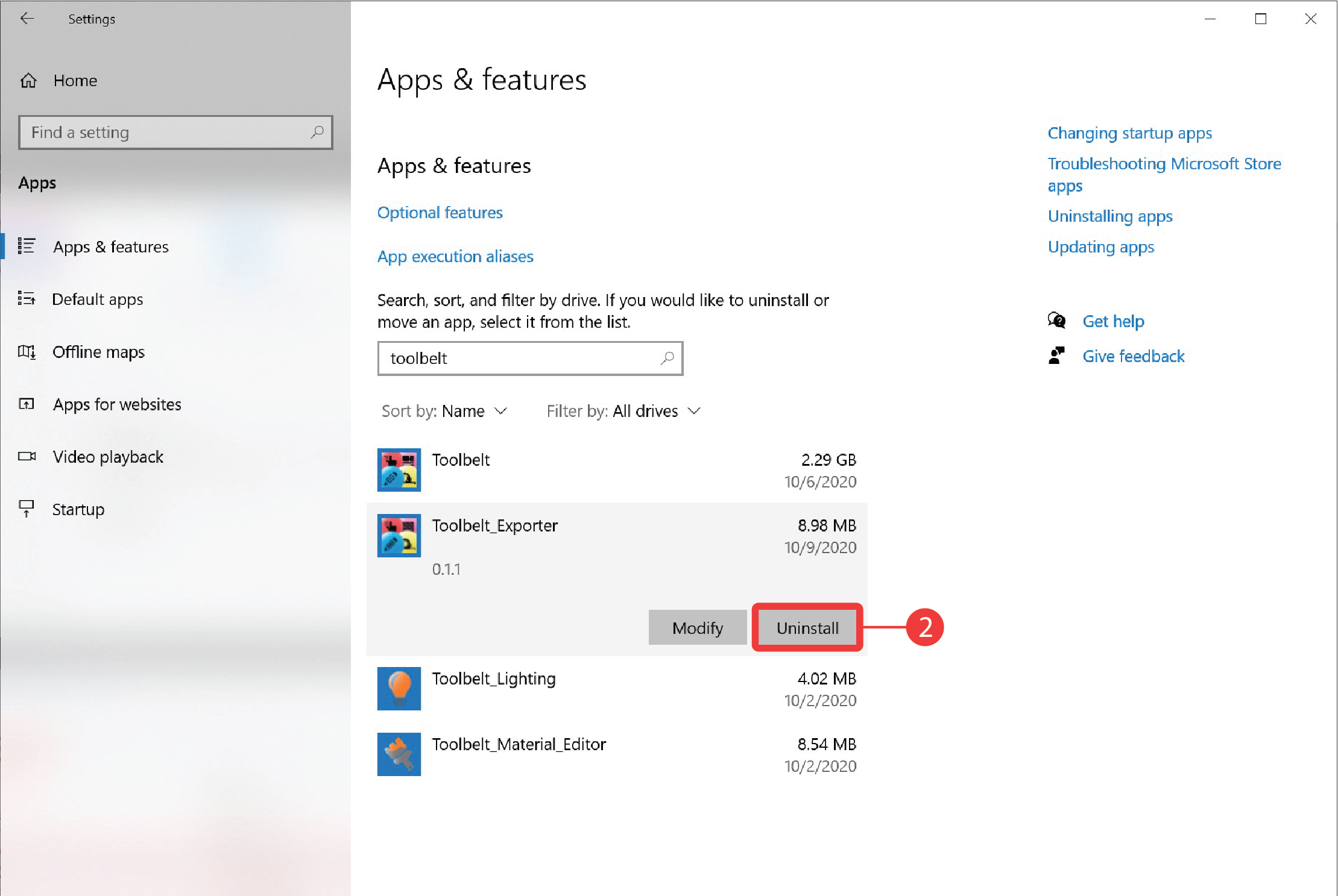 Search for Toolbelt Exporter and click the Uninstall button.