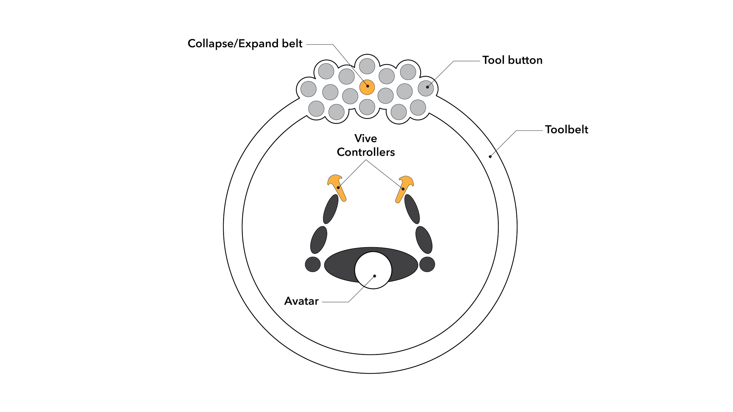 The main user interface for Toolbelt is a three-dimensional belt of tools around your waist that follows you through your VR experience. The trigger button on your controller is the main method of interacting with tools and objects in your space.